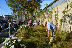 The scouts worked together to pull weeds, bag leaves and brush, and finally plant daffodil bulbs for next spring.